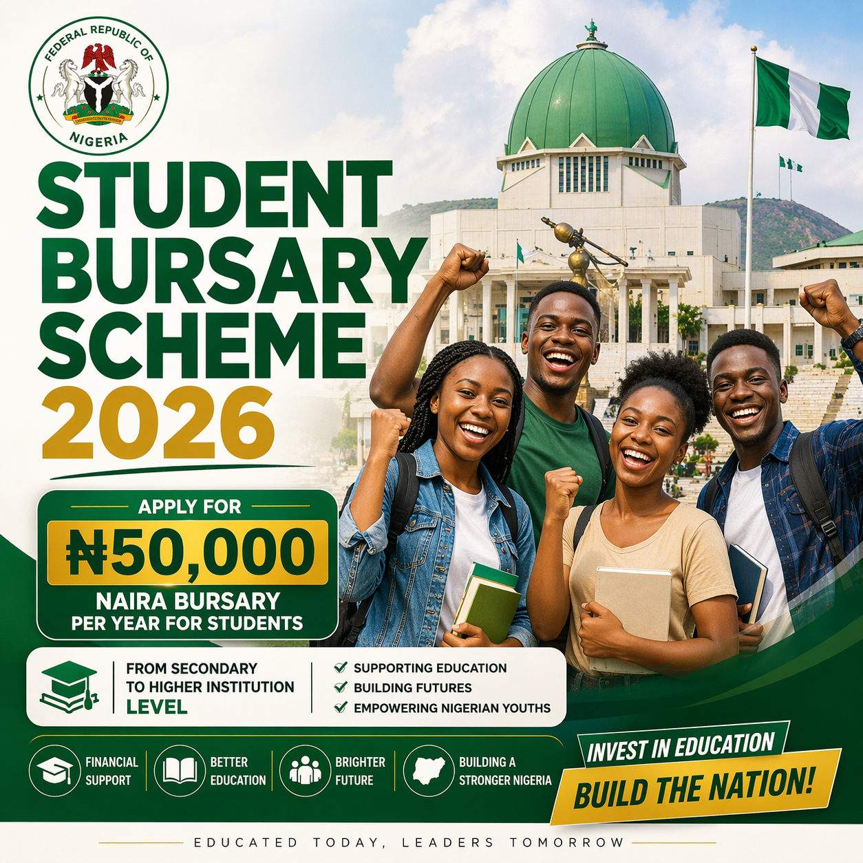 The Application process for FG ₦50,000 STUDENTS BURSARY 2026 SCHEME is currently ongoing, This initiative aims to provide financial assistance to all Students from Secondary level to Higher Institution. To take advantage of this opportunity, Click on the "Apply Now" below to fill the Application Form.